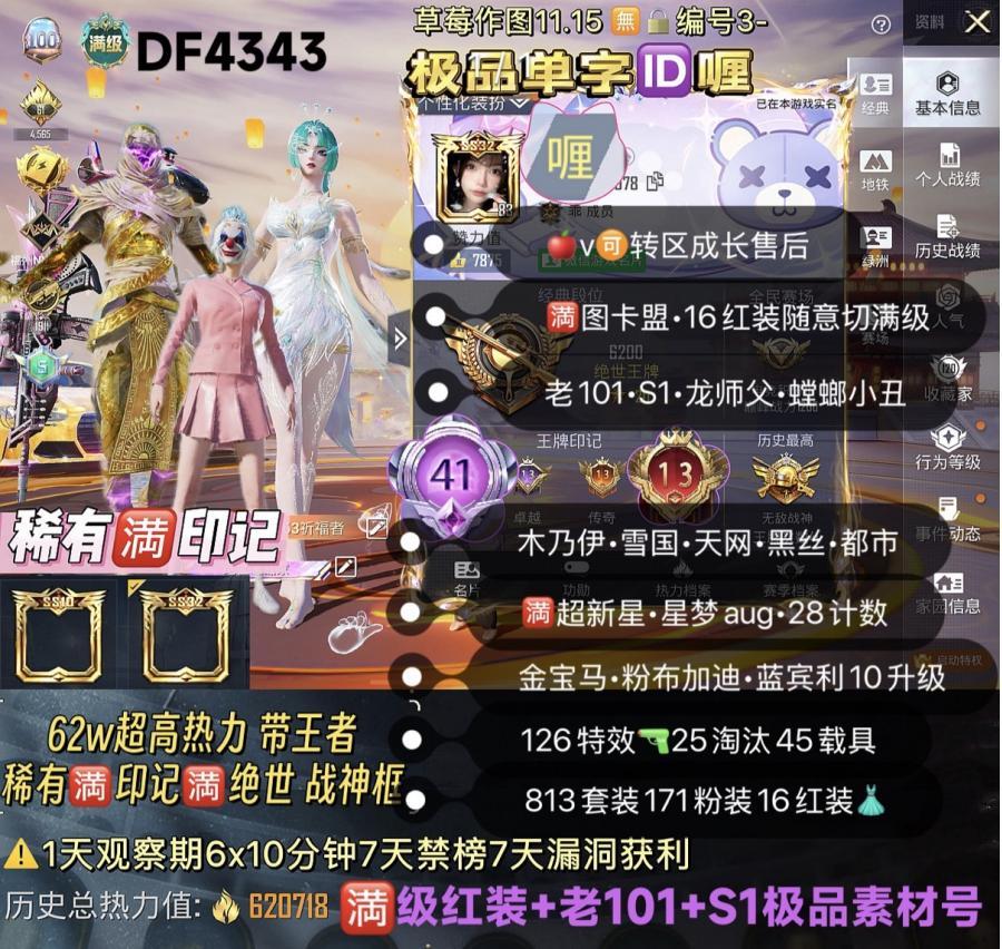 极品单字?喱 ?印记+?红装+老101+S1 【DF4343】?314820‼ ?v 带王者 62w超高热力 稀有满印记 满绝世 双战神框 ?图卡盟 16红装随意切满级 新老101 S1 龙师父 螳螂 小丑 木乃伊 雪国 天网 黑丝 都市 巧克力 金鞋 巡查 追光服 千面 126?45载具171粉装16红装 金宝马 粉布加迪 蓝宾利 10升级 双紫路特斯 迈凯伦 3幻星粉玛莎 金玛红蹦 金蹦 粉飞机 金银兰博 ?超新星m4 星梦aug28计数 ?至情?万古?骑士?仙履 ?玉魂?玉面 精灵 女娲 天蓬 墨龙 盖世 哪吒斯噶 沙丘 金蛇 魔法师 敖丙p90 双华 圣斗士